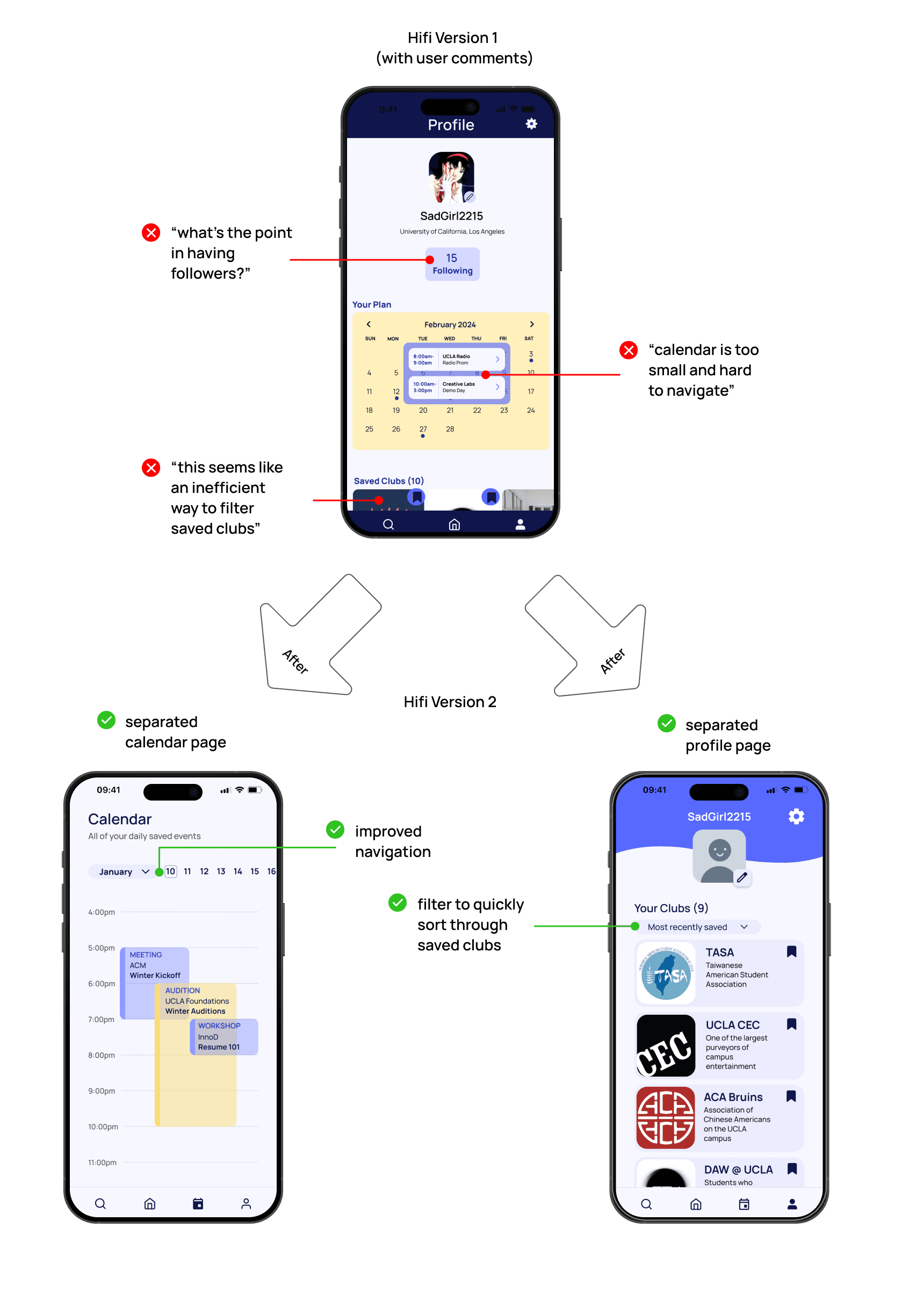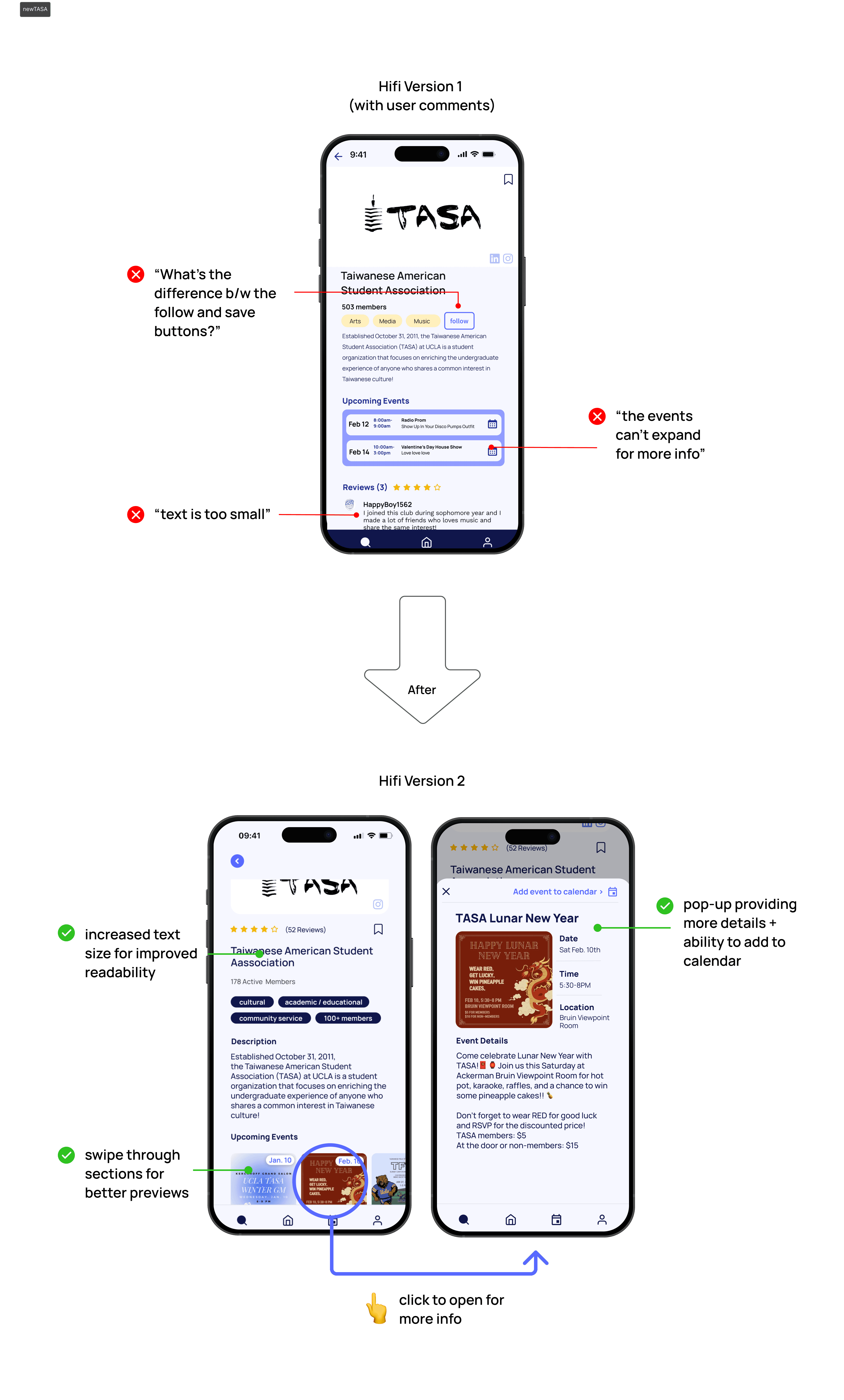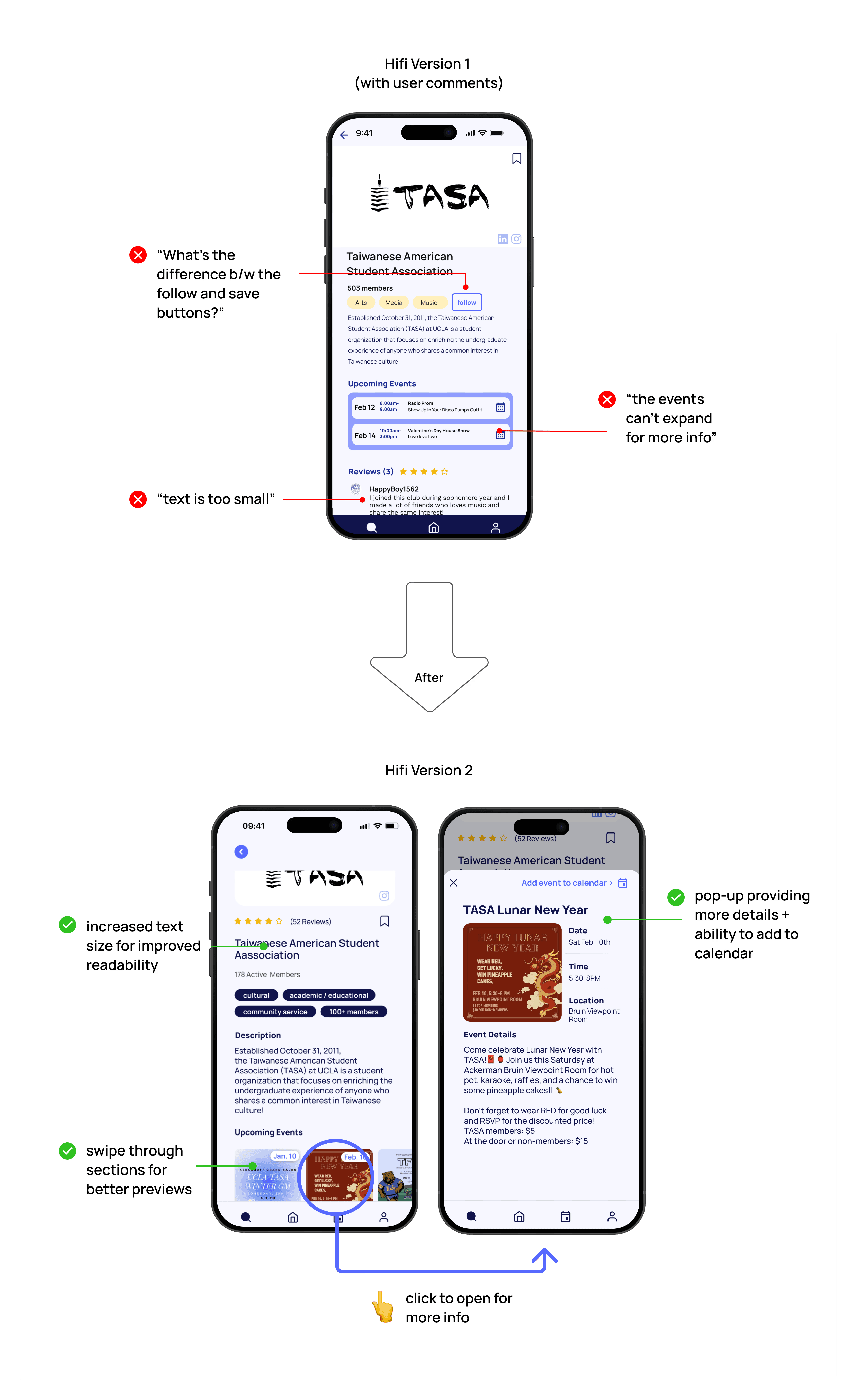 Things can always improve. Iterating our designs after getting feedback from target users was key to making our designs more user friendly, reminding us to always center their needs instead of our own