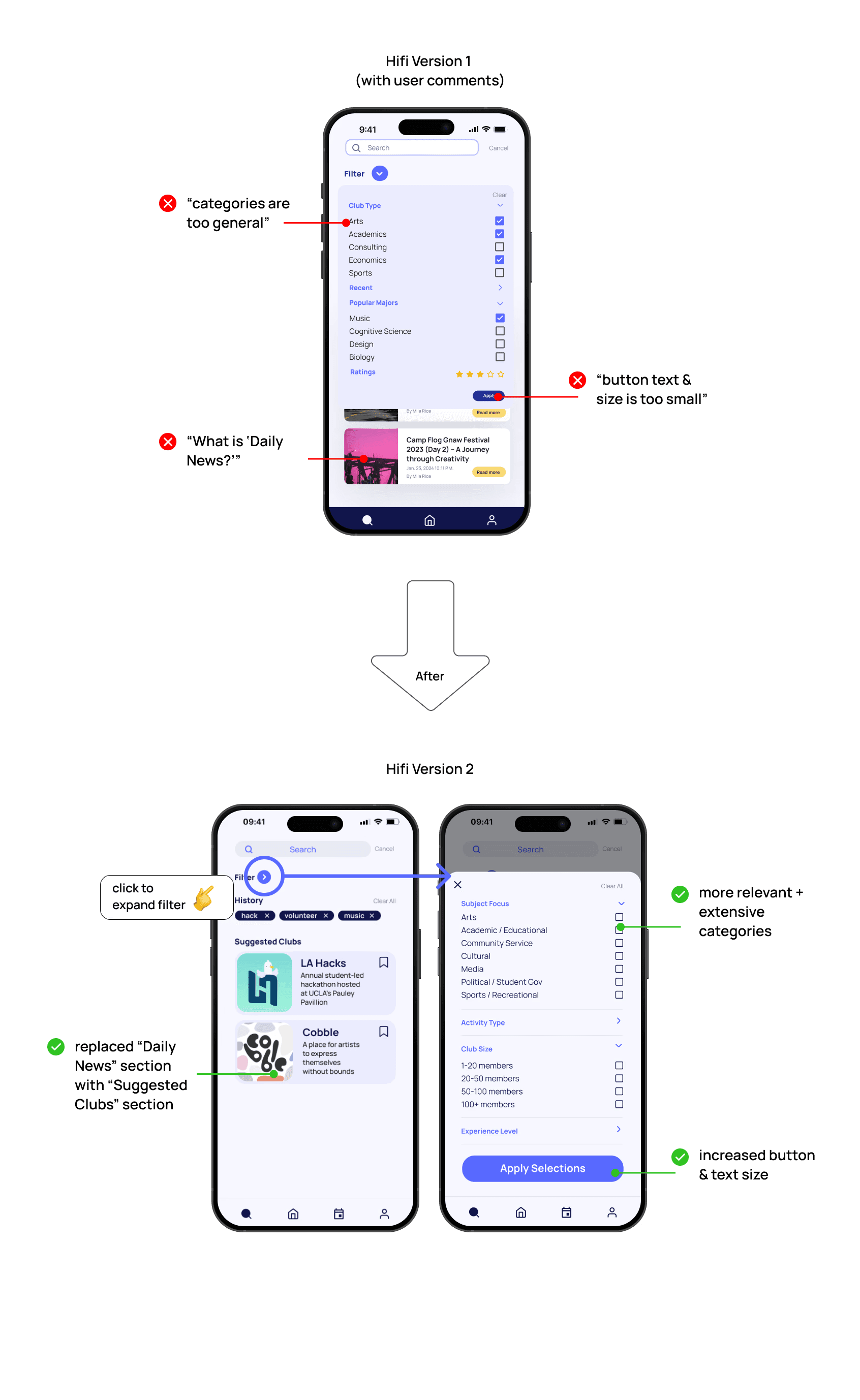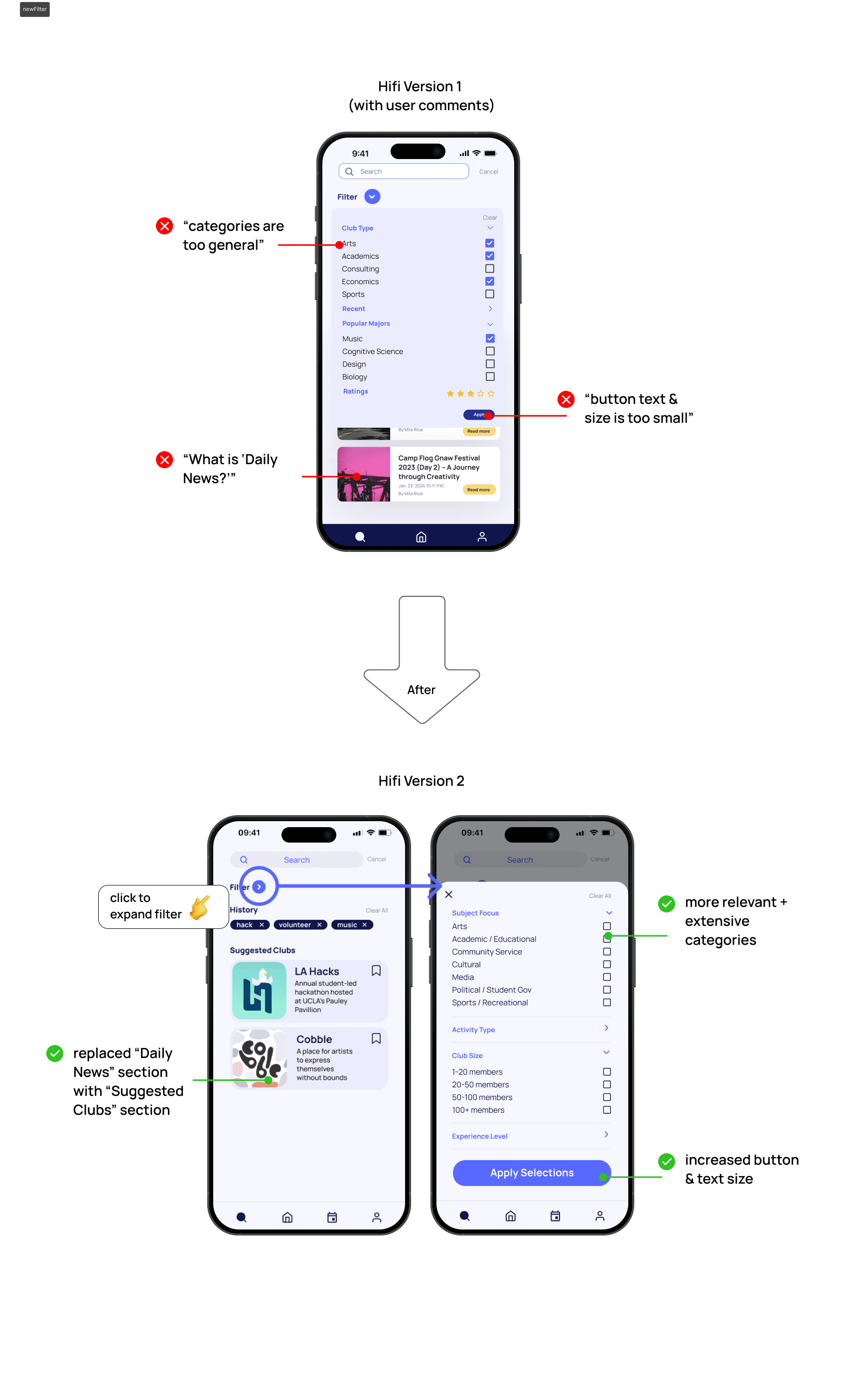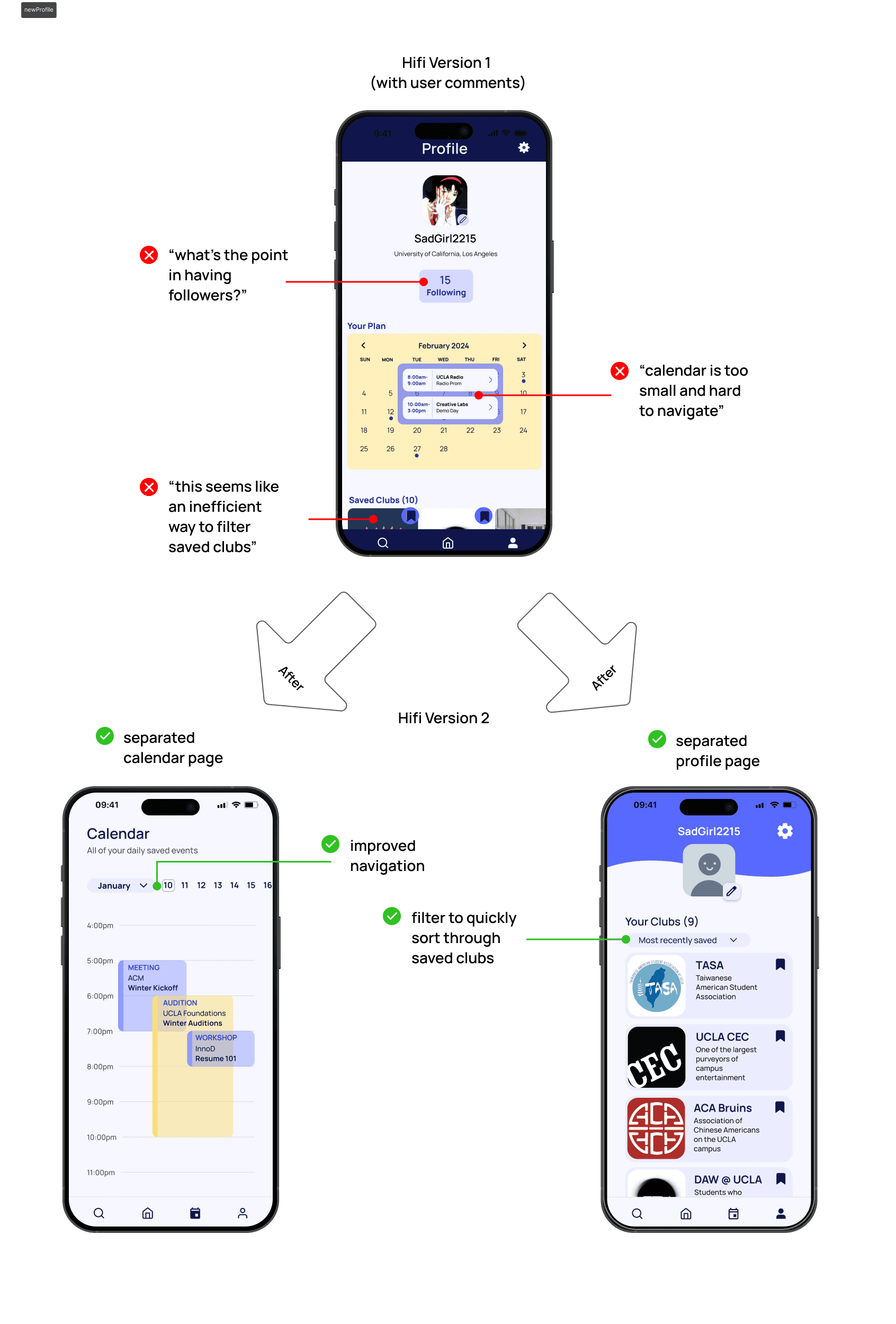 Things can always improve. Iterating our designs after getting feedback from target users was key to making our designs more user friendly, reminding us to always center their needs instead of our own