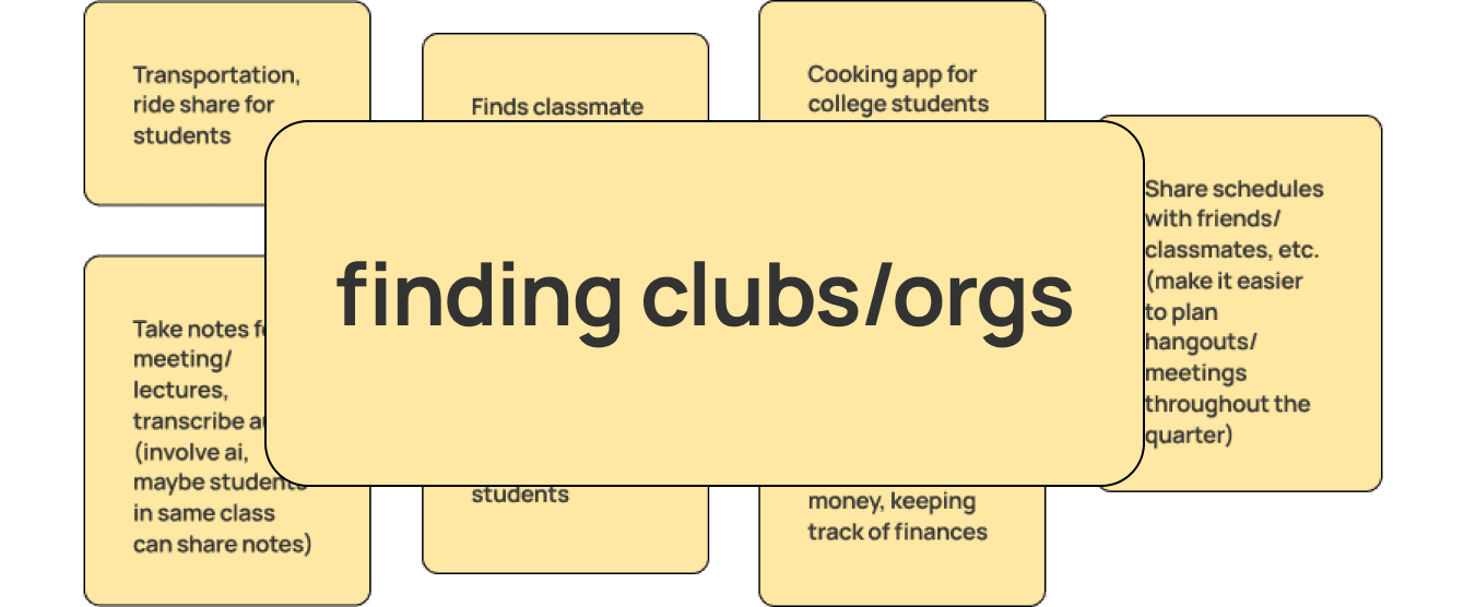 As college students, we are already aware of many of the problems that college students face. As time was of the essence, we quickly wrote down all the issues that we dealt with, and deliberated on what concept would most immediately benefit from an app. We decided on tackling the problem students face when trying to find campus organizations and clubs.