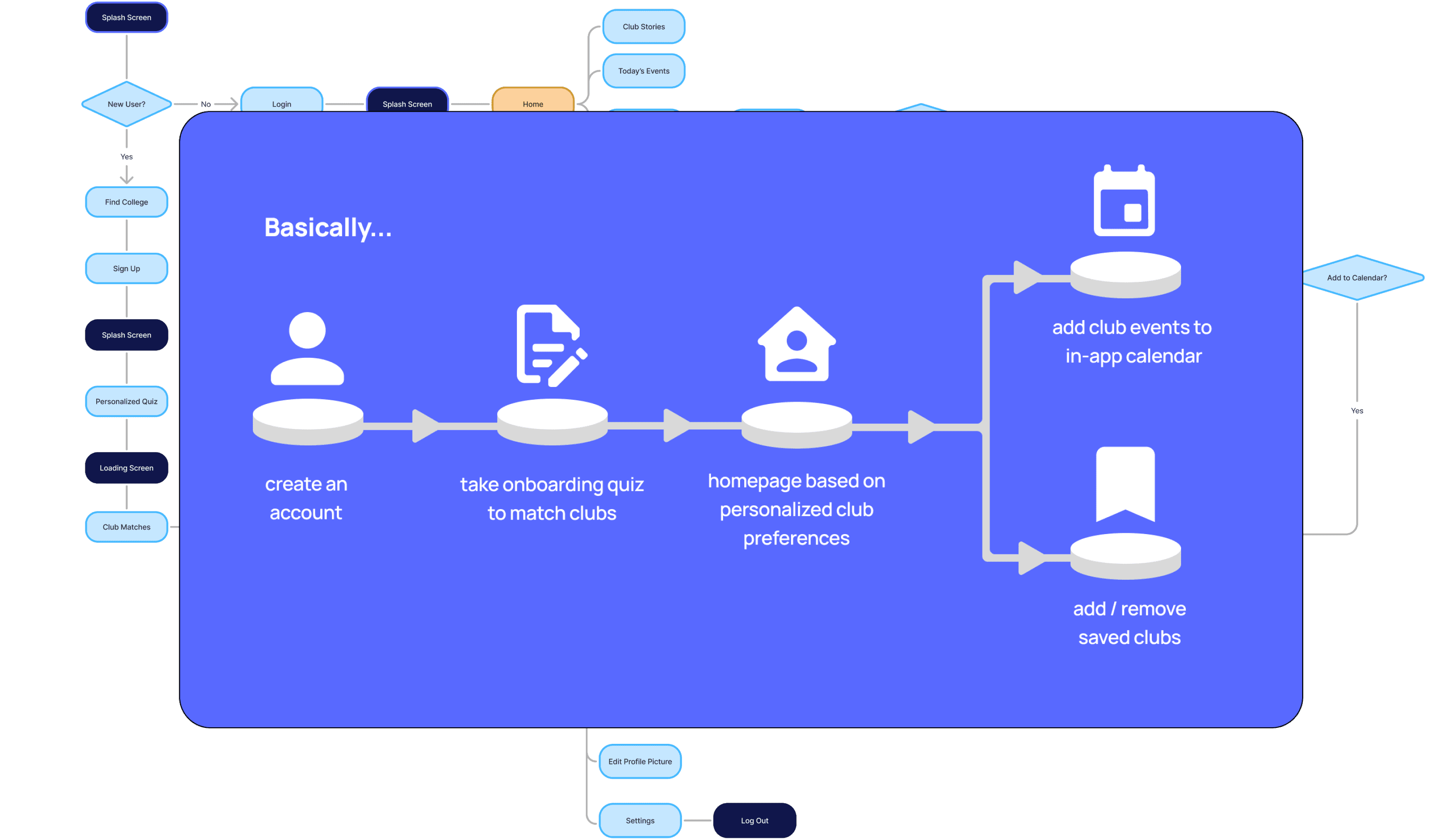 In order to emphasize all the features outlined in our solution, we made sure that they would be easy to access through the navigation bar. Overall, the flow is intentionally straightforward to be intuitive to users.