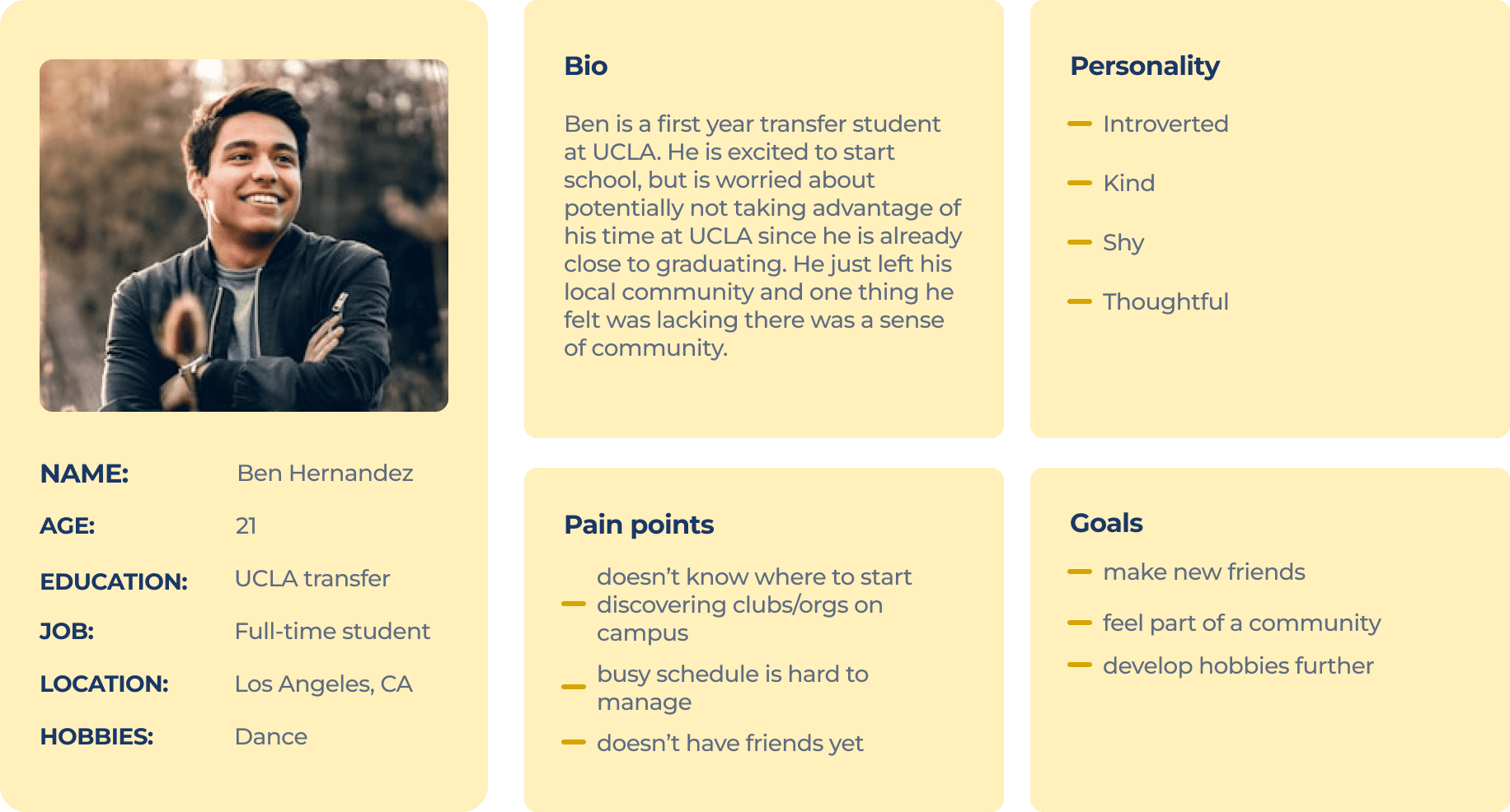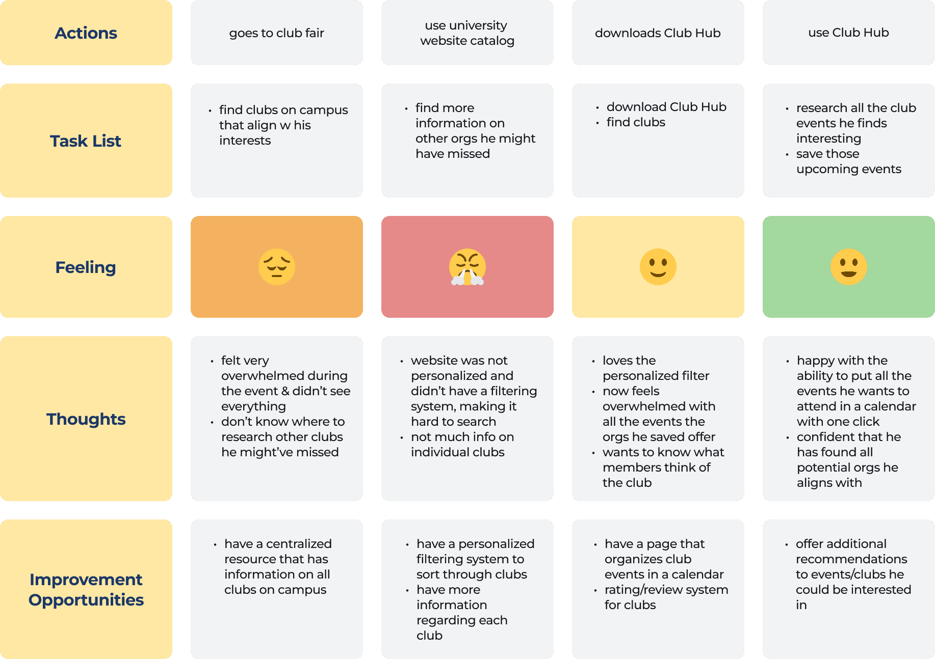 Our original plan was to create 3 user personas and user journeys. However, after creating the first one, we reevaluated its contribution to the broader process. Given that we already had survey responses from a pool of target users and their feelings, we felt that a persona wasn't as valuable for its intended application. Instead, we stuck with one and moved into solution ideation directly.