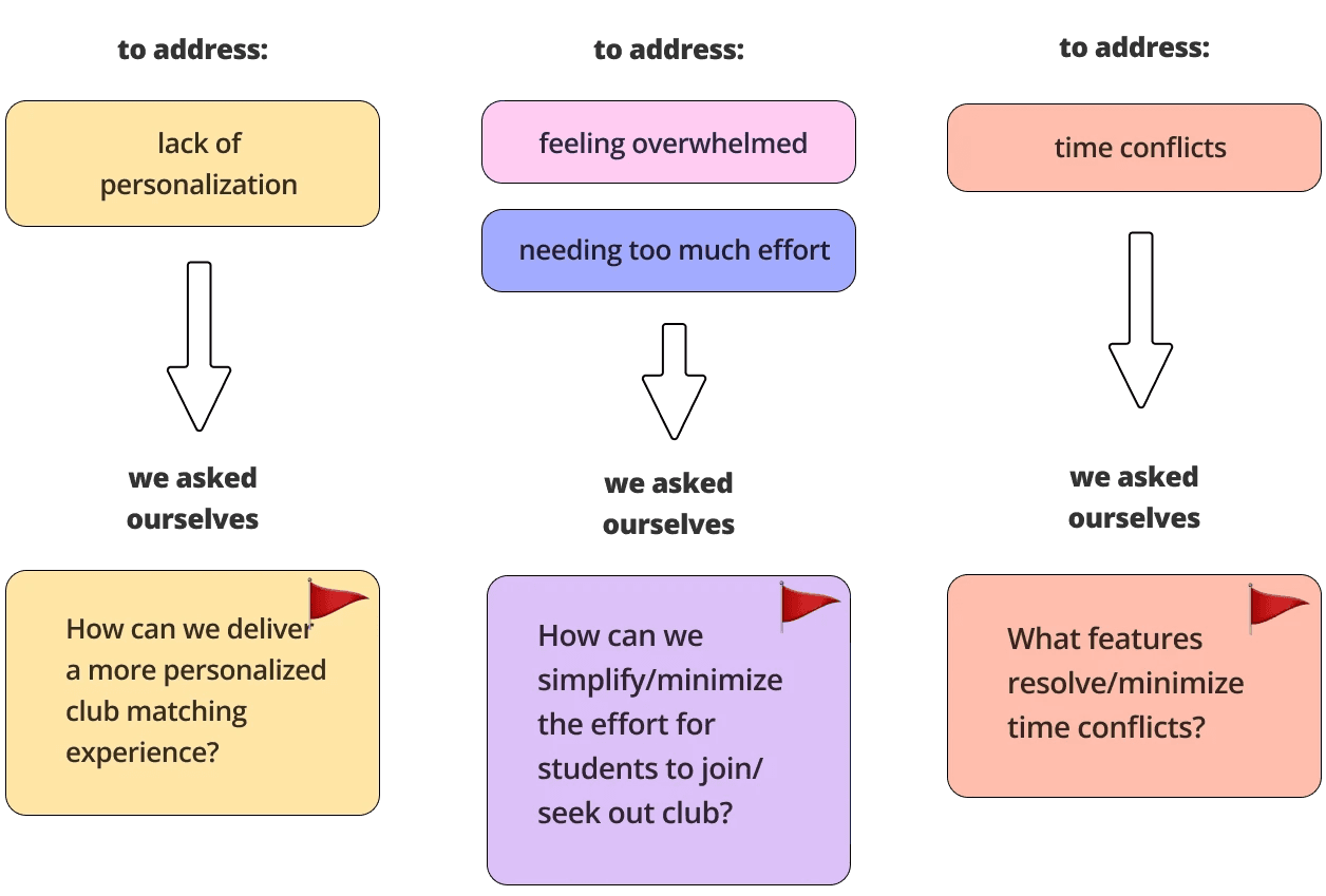 After extrapolating the main pain points from our survey, we had a better picture of the problems we needed to solve. We formatted these challenges into 3 questions that formed the foundation of our solution ideation.
