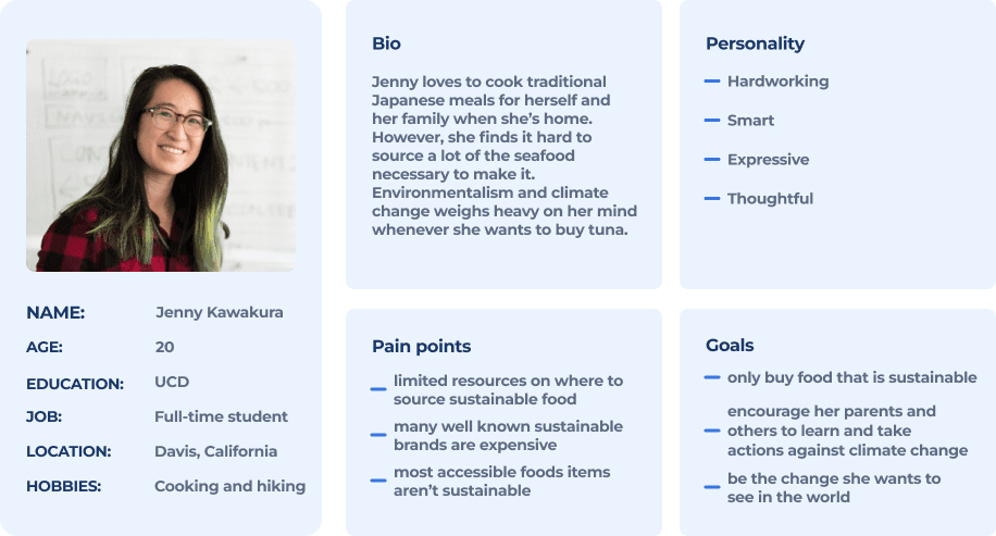 Our persona Jenny Kamakura, is full-time student and environmental studies major. She loves to cook meals from her Japanese culture, which is heavily based on using fresh seafood. Currently she has no reliable way to check if the seafood she buys is sustainable and the environmental impact of her choices weighs heavy on her.