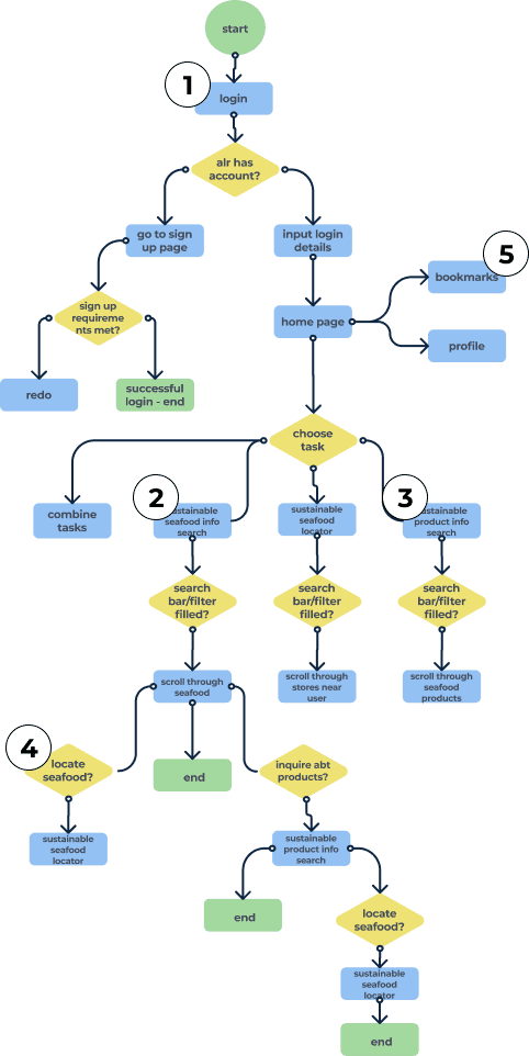Through analysis of user interviews and market research, I identified three core user needs: quick sustainability verification, local product availability, and educational resources. I synthesized these insights into a focused feature set and information architecture that prioritizes immediate access to sustainability data while shopping. The app's primary user flow centers on three key journeys: searching for sustainable seafood options, evaluating existing products on the market to verify their environmental impact, as well as a store locator.