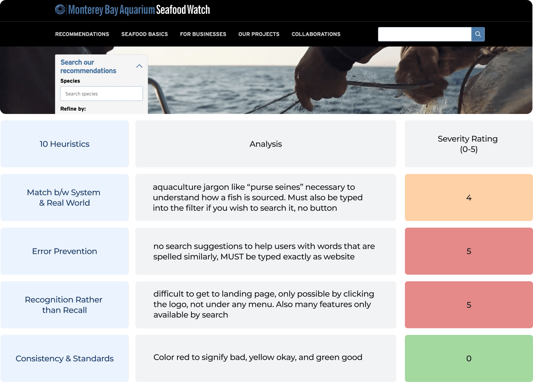 When studying competitor sites, I used seafoodwatch.org and msc.org, two websites specializing in the categorization of sustainable seafood. The analysis consisted of defining the sites usability by comparing different aspects to Nielsen’s 10 Usability Heuristics, such as error prevention, user control, and consistency. I then took those into consideration when designing my own platform.