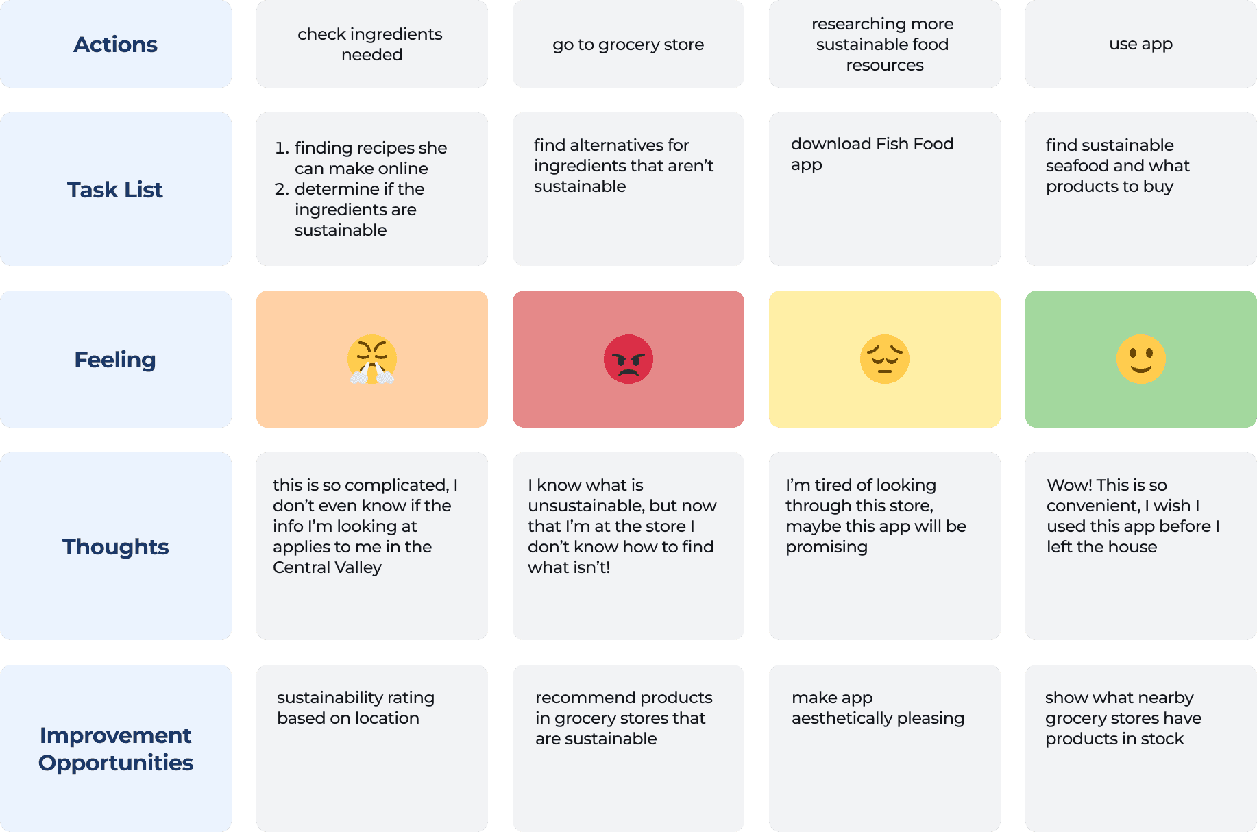 This scenario maps out the current pain points found from the research and how this user would benefit after using our app. From the initial frustration of not being able to find adequate information regarding sustainable seafood to finding out her favorite items are out of stock, our app helps to alleviate those stressers.