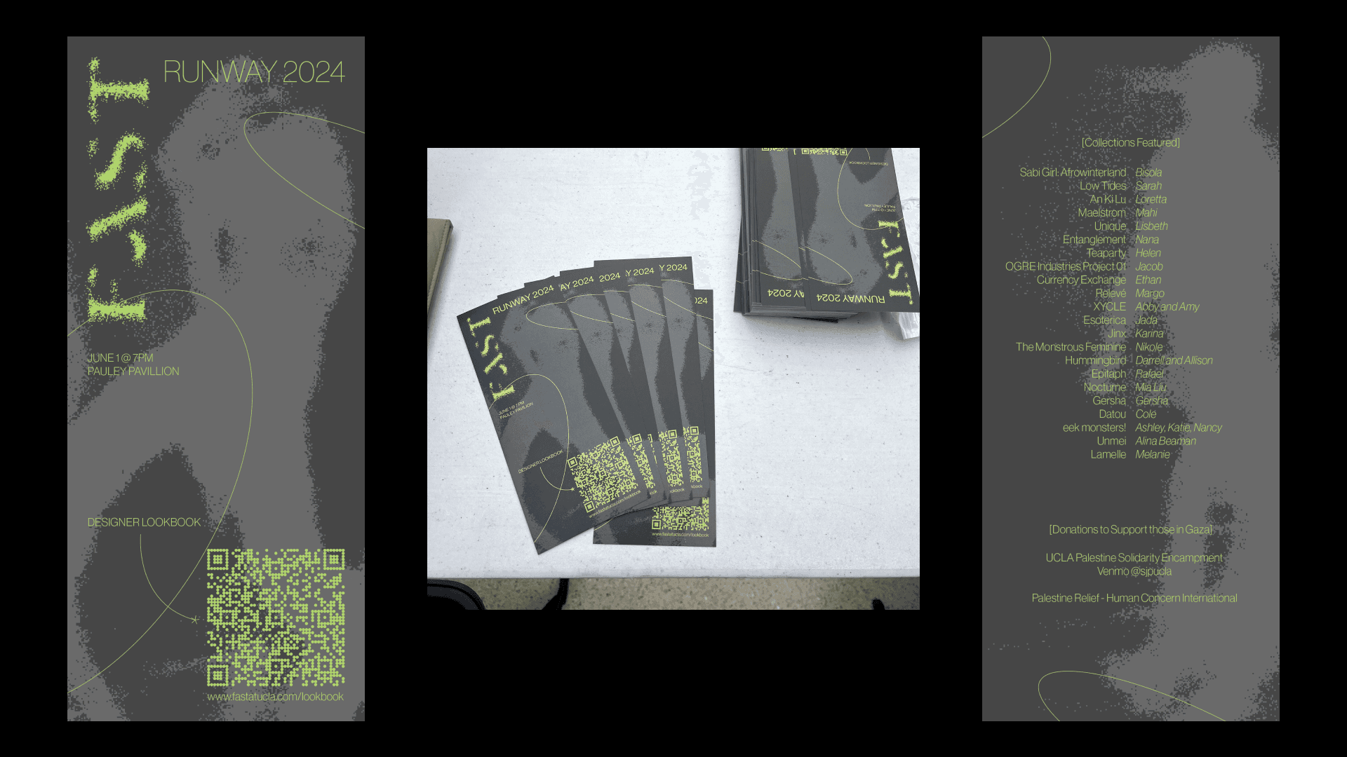 As a graphic designer for UCLA's largest fashion club, F.A.S.T., I created t-shirts distributed to all members and staff worn during the annual runway show hosted in spring 2024. I also designed all pamphlets handed out during the event, giving relevant information on all the collection designers as well as a link to a digital lookbook.